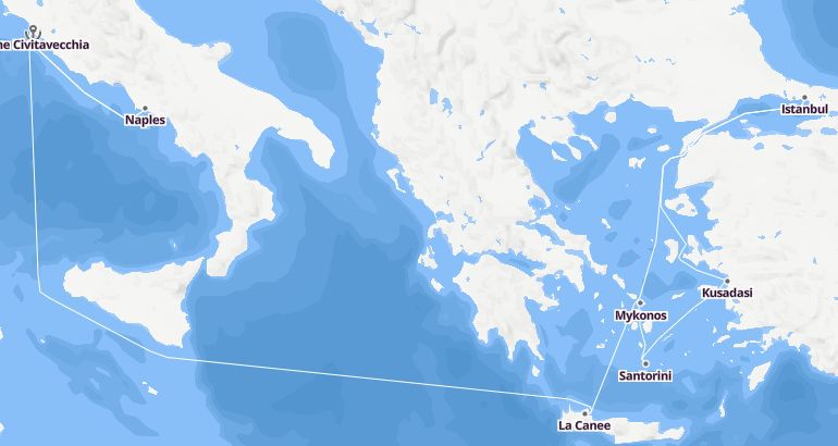 البحر المتوسط : إيطاليا، اليونان، ديك رومى - سيليبرتي أسنت الميناء : روما تشيفيتافيكيا المدة : 12 أيام السفينة : سيليبرتي أسنت الشركة : سيليبرتي كروزز أفضل الرحلات البحرية 2019-2020 مسار الرحلة: روما تشيفيتافيكيا، خانيا، اسطنبول، اسطنبول، كوساداسي، سانتوريني، ميكونوس، نابولي، روما تشيفيتافيكيا إكتشف المسار