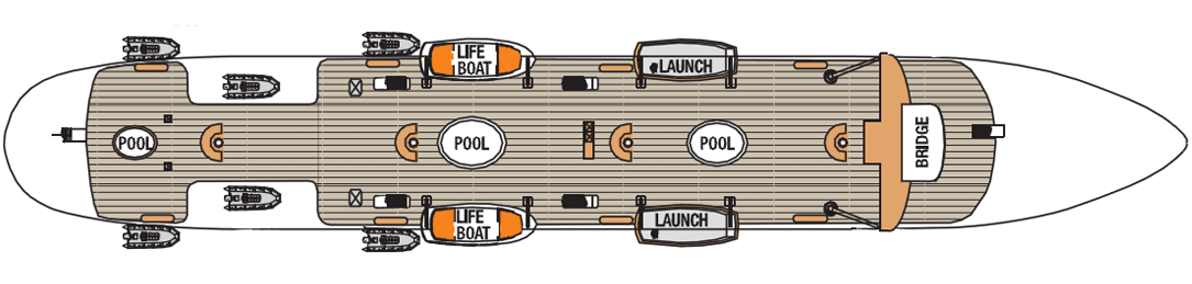 يحتوي Royal Clipper على ثلاثة حمامات سباحة على سطحه العلوي. سوف تستمتع بثلاث حمامات سباحة للاسترخاء وتجديد نشاطك قبل التوقف والرحلات الاستكشافية. من هناك ، ستتمتع بإطلالة رائعة على الأفق! لإطالة لحظات الاسترخاء هذه ، اذهب إلى Pool Bar حيث يمكنك الاستمتاع بالآيس كريم الجيد أو احتساء المشروبات المنعشة. حمام السباحة الرئيسي للسفينة مذهل للغاية ، حيث أنه مزود بقاعدة زجاجية .