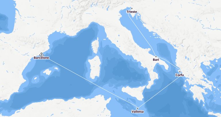 البحر المتوسط : إسبانيا، مالطا، اليونان، إيطاليا - إم إس سي فانتازيا الميناء : برشلونة المدة : 7 أيام السفينة : إم إس سي فانتازيا الشركة : إم إس سي كروز مسار الرحلة: برشلونة، لا فاليت، كورفو، باري، تريست إكتشف المسار