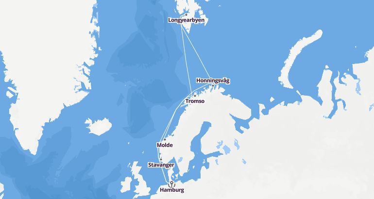 شمال أوروبا : ألمانيا، النرويج - أم أس سي بريسيوزا الميناء : هامبورغ المدة : 15 أيام السفينة : أم أس سي بريسيوزا الشركة : إم إس سي كروز مسار الرحلة: هامبورغ، مولد، ترومسو، لونجييربين، هونينعسفاج، هونينعسفاج، أولدن، ستافنجر، هامبورغ إكتشف المسار
