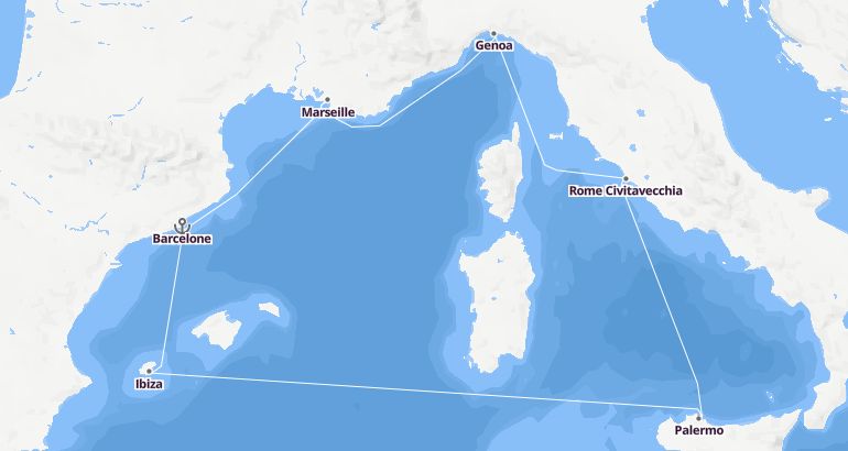 البحر المتوسط : إسبانيا، فرنسا، إيطاليا، جزر البليار - ام اس سي سي فيو الميناء : برشلونة المدة : 8 أيام السفينة : ام اس سي سي فيو الشركة : إم إس سي كروز مسار الرحلة: برشلونة، مرسيليا، جنوة، روما تشيفيتافيكيا، باليرمو، إيبيزا، برشلونة إكتشف المسار