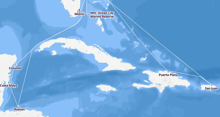 كروز البحر الكاريبي : الولايات المتحدة، هندوراس، المكسيك، جمهورية الدومينيكان، بورتو ريكو، باهاماس - إم إس سي ورلد أمريكا الميناء : ميامي المدة : 15 أيام السفينة : إم إس سي ورلد أمريكا الشركة : إم إس سي كروز مسار الرحلة: ميامي، رواتان، كوستا مايا، كوزوميل، ميامي، ميناء بلاتا، سان جوان، محمية أم أس سي أوسيآان كاي البحرية، ميامي إكتشف المسار