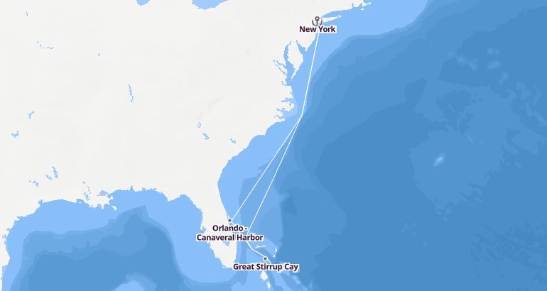 كروز البحر الكاريبي : الولايات المتحدة، باهاماس - نرويجيان بليس الميناء : نيويورك المدة : 9 أيام السفينة : نرويجيان بليس الشركة : نرويجيان كروز لاين مسار الرحلة: نيويورك، أورلاندو بورت كانافيرال، غرآات صتيرروب كاي، ناسو، نيويورك إكتشف المسار