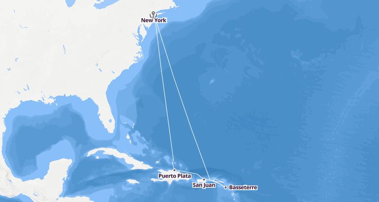 رحلات البحر الكاريبي - جزر الهند الغربية جزر الأنتيل : الولايات المتحدة، جمهورية الدومينيكان، بورتو ريكو، سانت كيتس ونيفيس، جزر فيرجن البريطانية، جزر الأنتيل الهولندية، جزر فيرجن - نرويجيان بليس الميناء : نيويورك المدة : 13 أيام السفينة : نرويجيان بليس الشركة : نرويجيان كروز لاين مسار الرحلة: نيويورك، ميناء بلاتا، سان جوان، باستير، تورتولا، فيليبسبورج سان مارتن، شارلوت أمالي سانت توماس، نيويورك إكتشف المسار