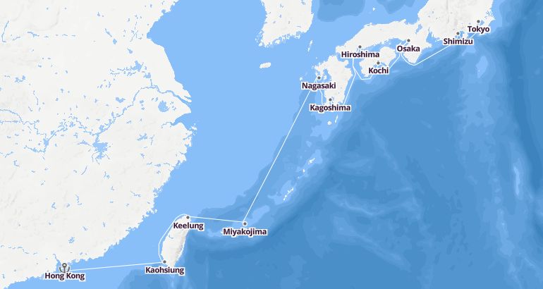 كروز آسيا : الصين، تايوان، اليابان - نرويجيان جاد الميناء : هونج كونج المدة : 12 أيام السفينة : نرويجيان جاد الشركة : نرويجيان كروز لاين مسار الرحلة: هونج كونج، كاوشيونغ، كيلونج، مياكوجيما، ناغازاكي، كاجوشيما، هيروشيما، كوشي، أوساكا، شيميزو، طوكيو إكتشف المسار