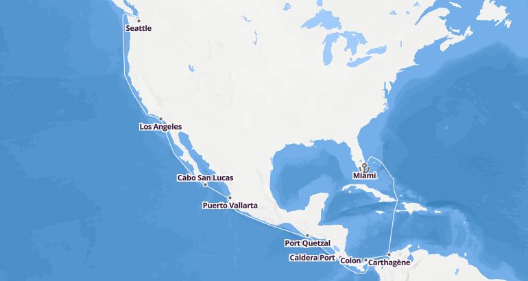 كروز قناة باناما : الولايات المتحدة، كولومبيا، بنما، كوستا ريكا، غواتيمالا، المكسيك - نرويجيان جوي الميناء : ميامي المدة : 19 أيام السفينة : نرويجيان جوي الشركة : نرويجيان كروز لاين مسار الرحلة: ميامي، قرطاجنة، كلون، بوآرتو كالديرا، ميناء كويتزال، بويرتو فالارتا، كابو سان لوكاس، لوس أنجلوس، سياتل إكتشف المسار