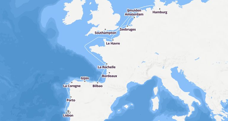 جنوب أوروبا : البرتغال، إسبانيا، فرنسا، بلجيكا، هولندا، ألمانيا، إنكلترا - نرويجيان ستار الميناء : لشبونة المدة : 15 أيام السفينة : نرويجيان ستار الشركة : نرويجيان كروز لاين مسار الرحلة: لشبونة، بورتو، لاكورون، خيخون، بلباو، بوردو، لاروشيل، لو هافر، زيبروغ، اجمويدين- أمستردام، هامبورغ، هامبورغ، ساوثهامبتون إكتشف المسار