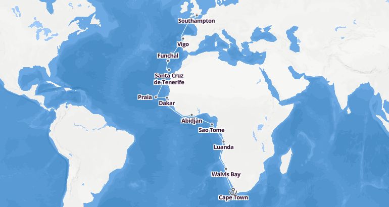 كروز في جنوب إفريقيا : إفريقيا الجنوبية، ناميبيا، أنغولا، ساو تومي وبرينسيبي، ساحل العاج، السنغال، الرأس الأخضر، جزر الكناري، جزيرة ماديرا، إسبانيا، إنكلترا - نرويجيان صن الميناء : كيب تاون المدة : 23 أيام السفينة : نرويجيان صن الشركة : نرويجيان كروز لاين مسار الرحلة: كيب تاون، والفيس باي، لواندا، ساو توم، أبيدجان، داكار، برايا، سانتا كروز من تينيريفي، صانتا كروز دآ لا بالما، فونشال، فيغو، ساوثهامبتون إكتشف المسار