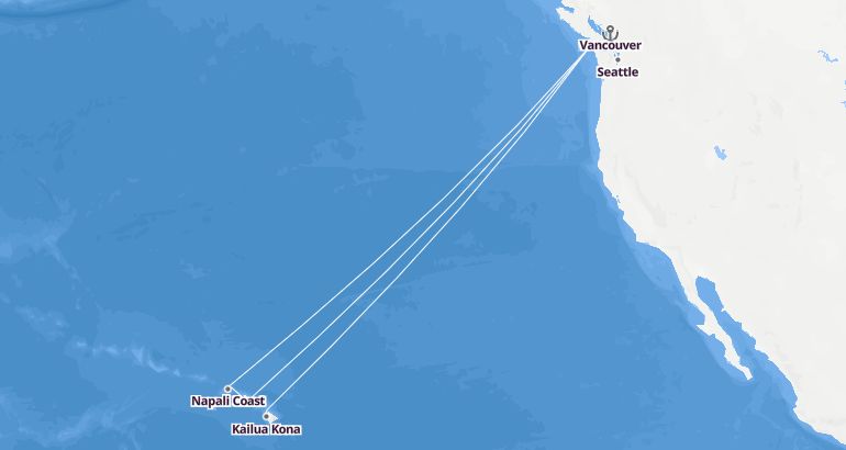 رحلات هاواي البحرية : كندا، الولايات المتحدة، هاواي - أنثم أوف ذا سيز الميناء : فانكوفر المدة : 13 أيام السفينة : أنثم أوف ذا سيز الشركة : رويال كاريبيان انترناشيونال مسار الرحلة: فانكوفر، سياتل، كايلو كونا، نابالي كوست، هونولولو، هونولولو إكتشف المسار