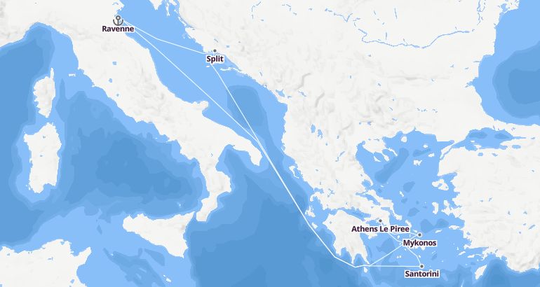 البحر المتوسط : إيطاليا، اليونان، كرواتيا - سفينة ألور أوف ذي سيز الميناء : رافينا المدة : 8 أيام السفينة : سفينة ألور أوف ذي سيز الشركة : رويال كاريبيان انترناشيونال مسار الرحلة: رافينا، سانتوريني، أثينا لبيري، ميكونوس، سبليت، رافينا إكتشف المسار