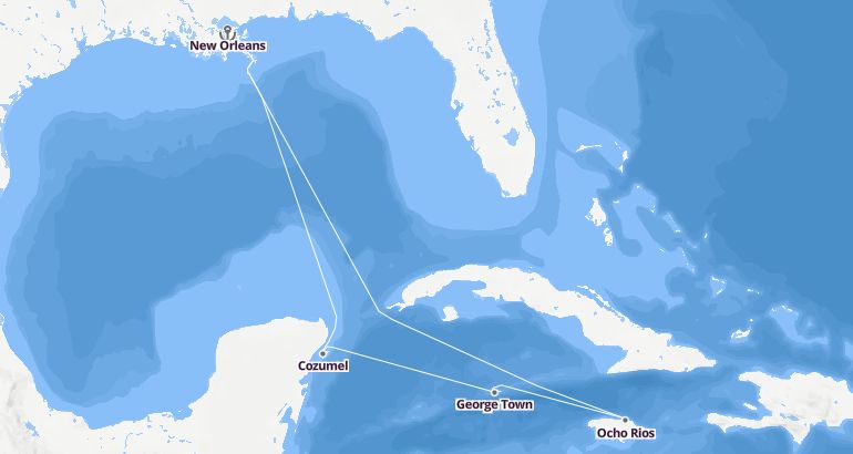 منطقة البحر الكاريبي - المكسيك - كوبا : الولايات المتحدة، المكسيك، جزر كايمان، جامايكا - مارينار أوف ذا سيز الميناء : نيو أورليانز المدة : 8 أيام السفينة : مارينار أوف ذا سيز الشركة : رويال كاريبيان انترناشيونال مسار الرحلة: نيو أورليانز، كوزوميل، جورج تاون، أشو ريوس، نيو أورليانز إكتشف المسار