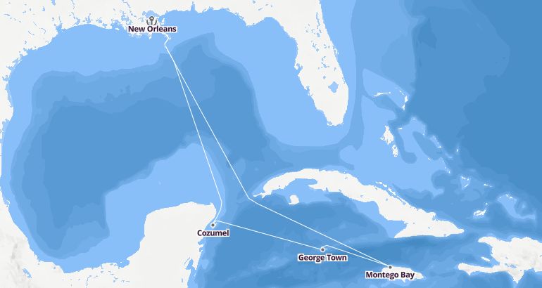 منطقة البحر الكاريبي - المكسيك - كوبا : الولايات المتحدة، المكسيك، جزر كايمان، جامايكا - مارينار أوف ذا سيز الميناء : نيو أورليانز المدة : 8 أيام السفينة : مارينار أوف ذا سيز الشركة : رويال كاريبيان انترناشيونال مسار الرحلة: نيو أورليانز، كوزوميل، جورج تاون، مونتيغو باي، نيو أورليانز إكتشف المسار