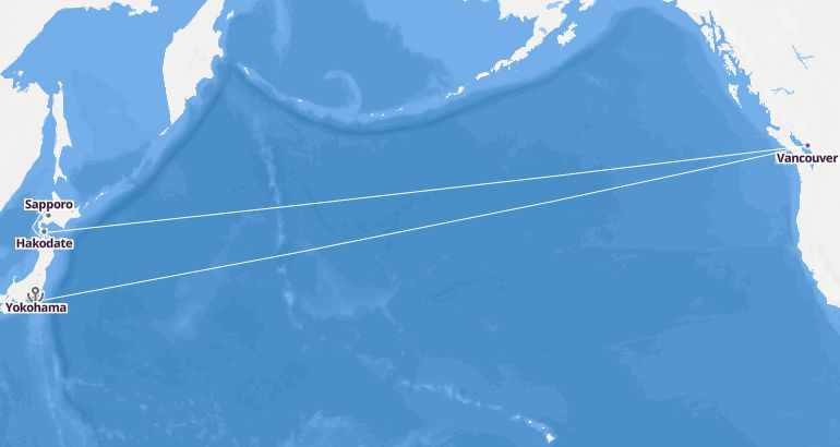 رحلة بحرية عبر المحيط : اليابان، كندا - أوفايشن أو ذا سيز الميناء : يوكوهاما المدة : 15 أيام السفينة : أوفايشن أو ذا سيز الشركة : رويال كاريبيان انترناشيونال مسار الرحلة: يوكوهاما، هاكوداته، أوموري، سابورو، فانكوفر، فانكوفر إكتشف المسار