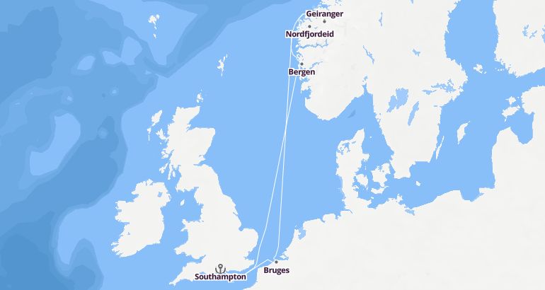 Itinerary: Southampton, Bruges, Fun day at sea, Nordfjordeid, Geiranger, Bergen, Fun day at sea, Southampton