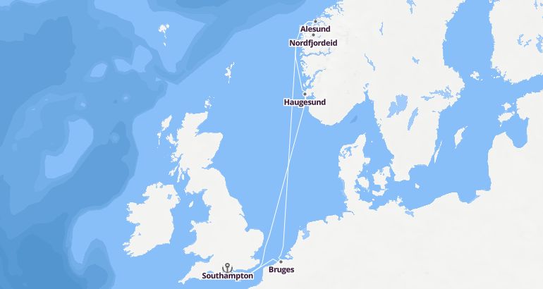 Itinerary: Southampton, Fun day at sea, Haugesund, Alesund, Nordfjordeid, Fun day at sea, Bruges, Southampton