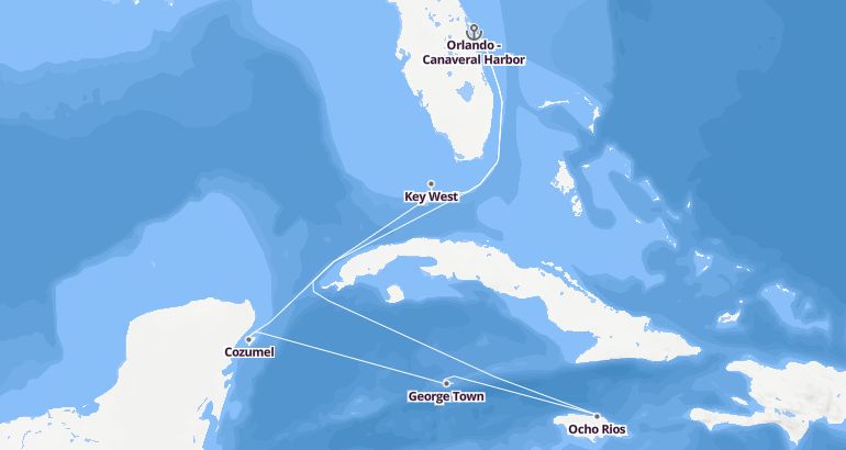 Itinerary: Orlando -Canaveral Harbor, Key West, Fun day at sea, Ocho Rios, George Town, Cozumel, Fun day at sea, Orlando -Canaveral Harbor