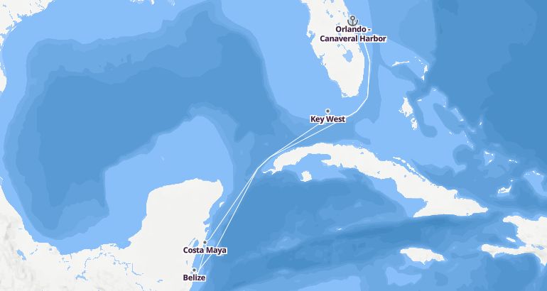 Itinerary: Orlando -Canaveral Harbor, Key West, Fun day at sea, Costa Maya, Belize, Fun day at sea, Fun day at sea, Orlando -Canaveral Harbor