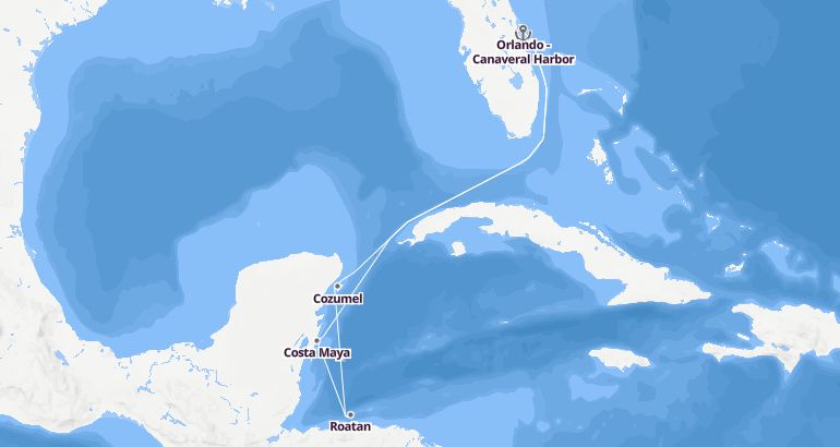 Itinerary: Orlando -Canaveral Harbor, Fun day at sea, Cozumel, Roatan, Costa Maya, Fun day at sea, Fun day at sea, Orlando -Canaveral Harbor