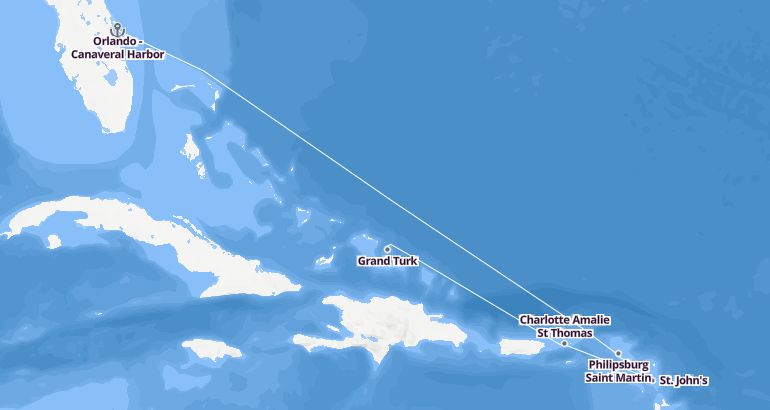 Itinerary: Orlando -Canaveral Harbor, Fun day at sea, Fun day at sea, Philipsburg Saint Martin, St. John's, Charlotte Amalie St Thomas, Fun day at sea, Grand Turk, Fun day at sea, Orlando -Canaveral Harbor