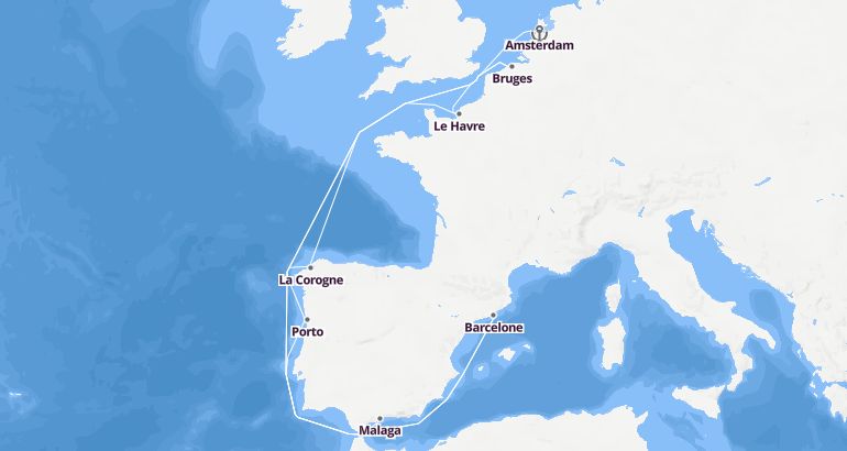 Itinerary: Amsterdam, Bruges, Le Havre, Fun day at sea, La Corogne, Porto, Fun day at sea, Malaga, Fun day at sea, Barcelone