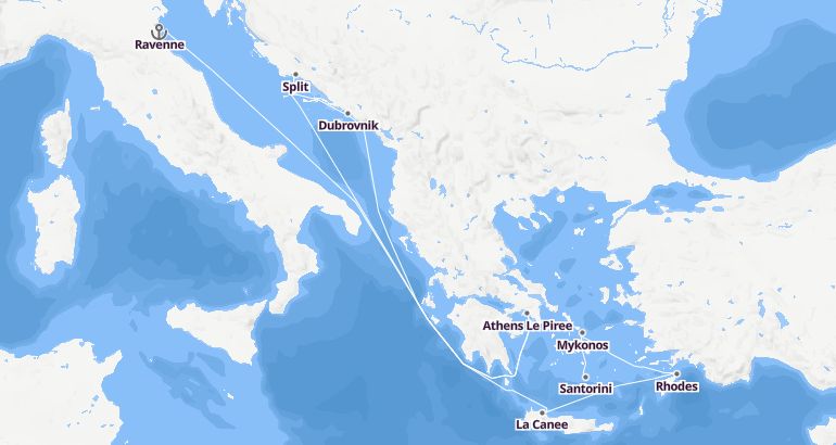 Itinerary: Ravenne, Split, Dubrovnik, Kotor, Fun day at sea, La Canee, Rhodes, Mykonos, Santorini, Fun day at sea, Athens Le Piree