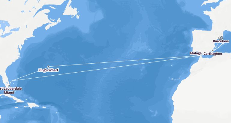Itinerary: Barcelone, Palma de Majorque, Carthagène, Malaga, Gibraltar, Fun day at sea, Fun day at sea, Fun day at sea, Fun day at sea, Fun day at sea, Fun day at sea, King’s Wharf, Fun day at sea, Fun day at sea, Fort Lauderdale Miami