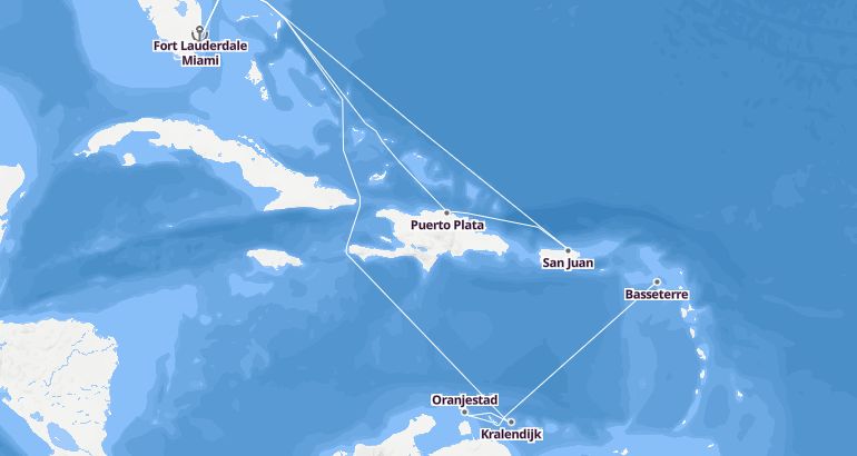Itinerary: Fort Lauderdale Miami, Fun day at sea, Fun day at sea, Kralendijk, Oranjestad, Willemstad, Fun day at sea, Basseterre, San Juan, Puerto Plata, Fun day at sea, Fort Lauderdale Miami
