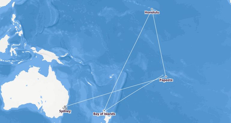 Itinerary: Sydney, Fun day at sea, Fun day at sea, Bay of Islands, Auckland, Fun day at sea, International date line, Fun day at sea, Fun day at sea, Raiatea, Papeete, Moorea, Fun day at sea, Fun day at sea, Fun day at sea, Fun day at sea, Fun day at sea, Honolulu, Honolulu