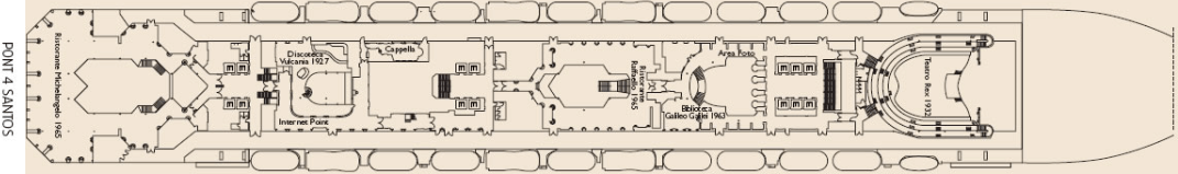 The Costa Fortuna has 3 swimming pools on board: the Lido Oceania 1932, the Lido Barcelona and the Lido Colombo 1954. The Colombo pool is weatherproof with a glass roof that allows guests to swim even when it rains. There are also two Jacuzzis around the pool. If you want to grab a bite, there are bars with burgers and grills. The Lido Oceania 1932 also has two Jacuzzis and a water slide that ends up in the Lido Barcelona pool. A lot of fun for your children!