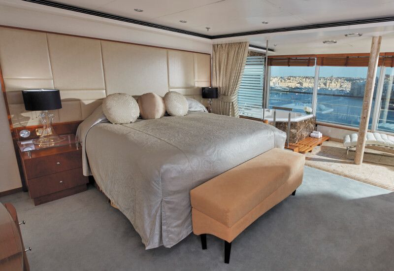 The Voyager suites are just incredible. They can accommodate up to 4 passengers and measure 52 m². You'll have a lounge area, a bedroom area with a king-size bed (or two twins), a separate dressing room, as well as a private marble bathroom with its own shower and bathtub. In addition, to enjoy the sunrises and sunsets from your cabin, there is a 5 m² balcony. Moments of sharing and pleasure await you in the ship's Voyager suites.