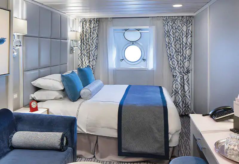Let's move on to the exterior cabins. Generally speaking, they are quite similar to the interior ones, as they have a surface area of 15m², a lounge and a bathroom as well as a full set of equipment (fridge, coffee table, television, mini-bar, etc.). The big advantage of these rooms is their large windows. You can enjoy the sun and the landscapes. Rest, well-being and wonder guaranteed.