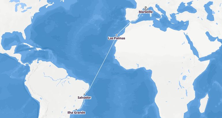 Itinerary: Marseille, Barcelone, Fun day at sea, Fun day at sea, Las Palmas, Fun day at sea, Fun day at sea, Fun day at sea, Fun day at sea, Fun day at sea, Fun day at sea, Salvador, Ilhéus, Fun day at sea, Ilha Grande, Rio de Janeiro