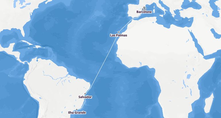 Itinerary: Barcelone, Fun day at sea, Fun day at sea, Las Palmas, Fun day at sea, Fun day at sea, Fun day at sea, Fun day at sea, Fun day at sea, Fun day at sea, Salvador, Ilhéus, Fun day at sea, Ilha Grande, Rio de Janeiro