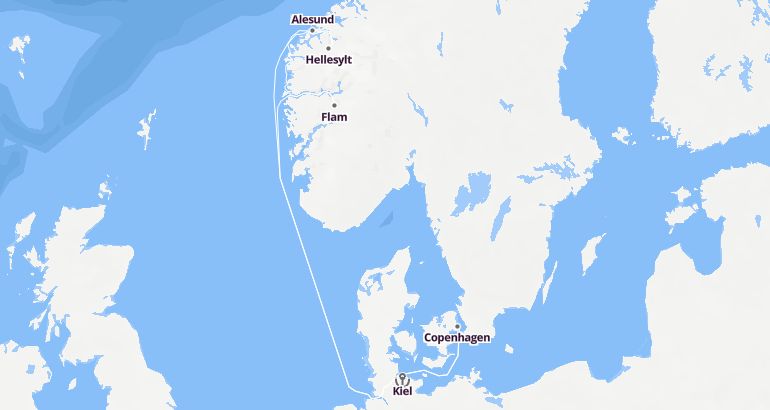 Itinerary: Kiel, Copenhagen, Fun day at sea, Hellesylt, Alesund, Flam, Fun day at sea, Kiel