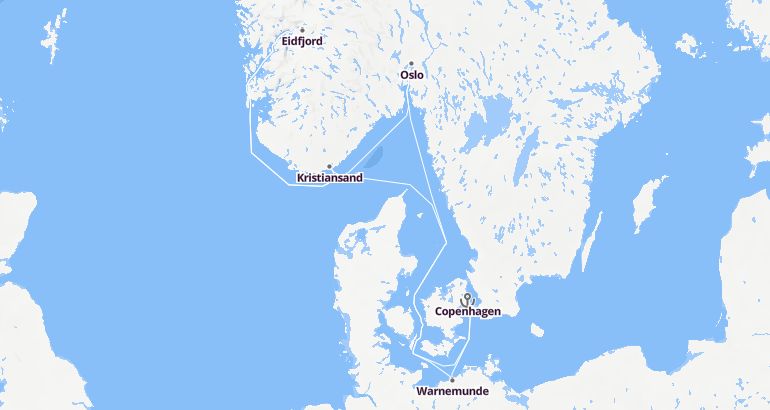 See the routeItinerary: Copenhagen, Warnemunde, Fun day at sea, Kristiansand, Eidfjord, Lyngdal, Oslo, Copenhagen
