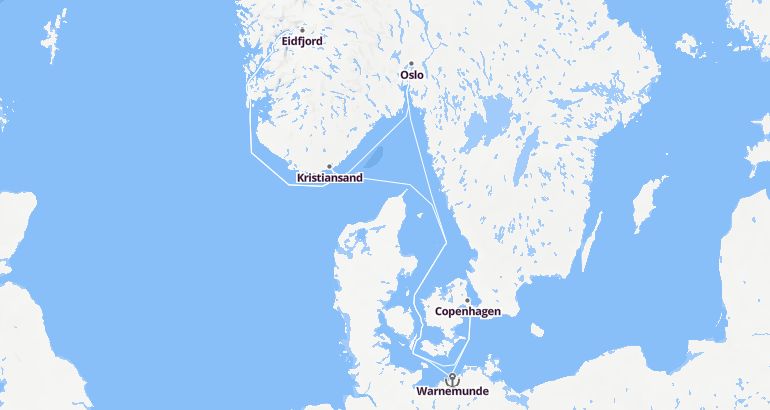 See the routeItinerary: Warnemunde, Fun day at sea, Kristiansand, Eidfjord, Lyngdal, Oslo, Copenhagen, Warnemunde