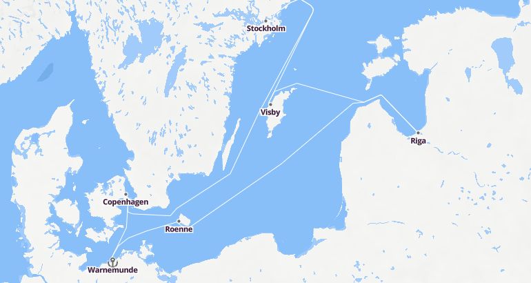 Itinerary: Warnemunde, Roenne, Riga, Visby, Stockholm, Fun day at sea, Copenhagen, Warnemunde