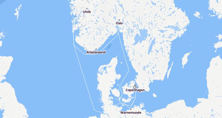 See the routeItinerary: Copenhagen, Warnemunde, Fun day at sea, Ulvik, Kristiansand, Sandnes, Oslo, Copenhagen
