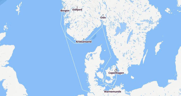 See the routeItinerary: Copenhagen, Warnemunde, Fun day at sea, Eidfjord, Bergen, Kristiansand, Oslo, Copenhagen