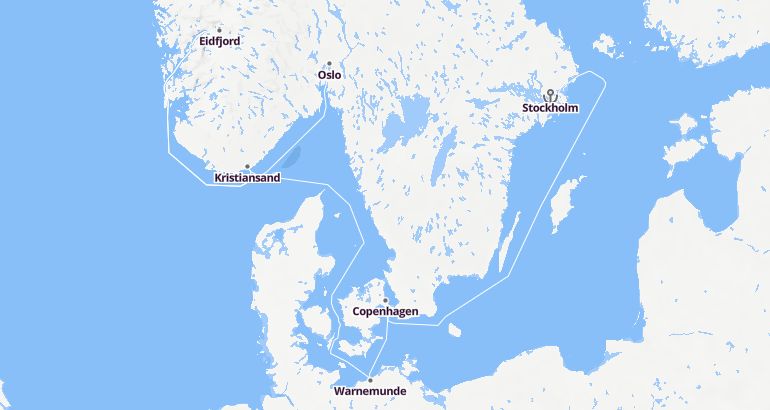 Itinerary: Stockholm, Fun day at sea, Copenhagen, Warnemunde, Fun day at sea, Kristiansand, Eidfjord, Lyngdal, Oslo