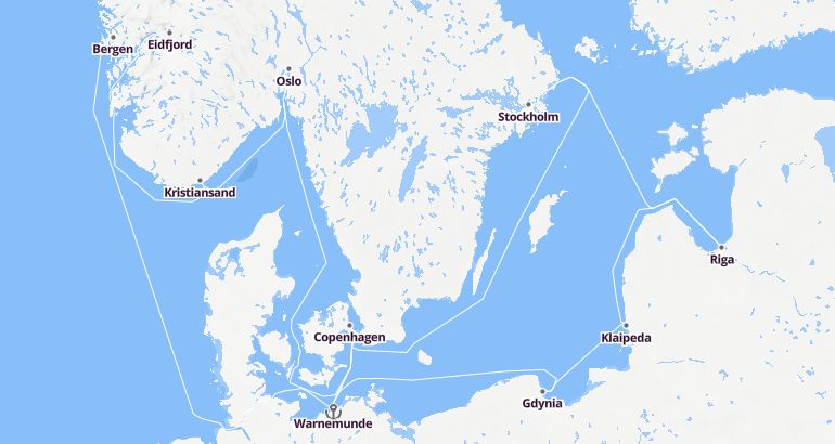 Itinerary: Warnemunde, Gdynia, Klaipeda, Riga, Stockholm, Fun day at sea, Copenhagen, Warnemunde, Fun day at sea, Bergen, Eidfjord, Kristiansand, Oslo, Copenhagen, Warnemunde