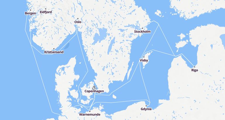 Itinerary: Copenhagen, Warnemunde, Gdynia, Visby, Riga, Stockholm, Fun day at sea, Copenhagen, Warnemunde, Fun day at sea, Eidfjord, Bergen, Kristiansand, Oslo, Copenhagen