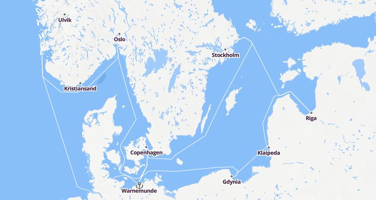 Itinerary: Warnemunde, Fun day at sea, Ulvik, Kristiansand, Sandnes, Oslo, Copenhagen, Warnemunde, Gdynia, Klaipeda, Riga, Stockholm, Fun day at sea, Copenhagen, Warnemunde