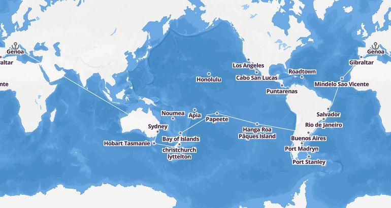 Itinerary: Genoa, Marseille, Barcelone, Fun day at sea, Gibraltar, Casablanca, Fun day at sea, Fun day at sea, Fun day at sea, Mindelo Sao Vicente, Fun day at sea, Fun day at sea, Fun day at sea, Fun day at sea, Salvador, Fun day at sea, Rio de Janeiro, Rio de Janeiro, Fun day at sea, Fun day at sea, Buenos Aires, Buenos Aires, Fun day at sea, Fun day at sea, Port Madryn, Fun day at sea, Port Stanley, Fun day at sea, Fun day at sea, Ushuaia, Ushuaia, Fun day at sea, Fun day at sea, Puerto Montt, Fun day at sea, Valparaiso, Valparaiso, Fun day at sea, Fun day at sea, Fun day at sea, Fun day at sea, Hanga Roa Pâques Island, Fun day at sea, Fun day at sea, Bounty Bay Passage, Fun day at sea, Fun day at sea, Papeete, Papeete, Moorea, Fun day at sea, Aitutaki, Rarotonga, Fun day at sea, Fun day at sea, Fun day at sea, Fun day at sea, Fun day at sea, Bay of Islands, Auckland, Tauranga, Fun day at sea, christchurch lyttelton, Dunedin, Milford Sound Navigation, Fun day at sea, Hobart Tasmanie, Hobart Tasmanie, Fun day at sea, Sydney, Sydney, Fun day at sea, Fun day at sea, Noumea, Fun day at sea, Luganville, Fun day at sea, Fun day at sea, Fun day at sea, Apia, Pago Pago, Fun day at sea, Fun day at sea, Fun day at sea, Fun day at sea, Fun day at sea, Honolulu, Hilo, Fun day at sea, Fun day at sea, Fun day at sea, Fun day at sea, Fun day at sea, Los Angeles, Fun day at sea, Fun day at sea, Cabo San Lucas, Fun day at sea, Fun day at sea, Fun day at sea, Puntarenas, Fun day at sea, Crossing the Panama Canal, Crossing the Panama Canal, Fun day at sea, Ocho Rios, Fun day at sea, Fun day at sea, Roadtown, Philipsburg Saint Martin, Fun day at sea, Fun day at sea, Fun day at sea, Fun day at sea, Fun day at sea, Fun day at sea, Las Palmas, Fun day at sea, Fun day at sea, Palma de Majorque, Fun day at sea, Naples, Rome Civitavecchia, Genoa