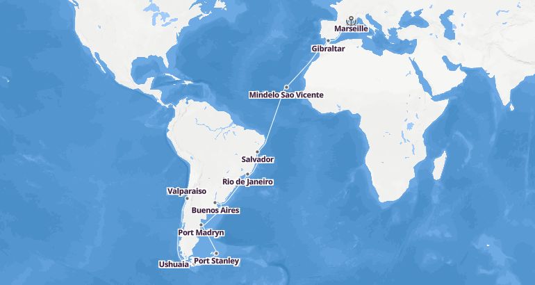 Itinerary: Marseille, Barcelone, Fun day at sea, Gibraltar, Casablanca, Fun day at sea, Fun day at sea, Fun day at sea, Mindelo Sao Vicente, Fun day at sea, Fun day at sea, Fun day at sea, Fun day at sea, Salvador, Fun day at sea, Rio de Janeiro, Rio de Janeiro, Fun day at sea, Fun day at sea, Buenos Aires, Buenos Aires, Fun day at sea, Fun day at sea, Port Madryn, Fun day at sea, Port Stanley, Fun day at sea, Fun day at sea, Ushuaia, Ushuaia, Fun day at sea, Fun day at sea, Puerto Montt, Fun day at sea, Valparaiso, Valparaiso