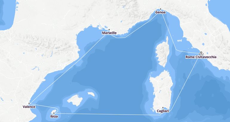 Itinerary: Rome Civitavecchia, Genoa, Marseille, Valence, Ibiza, Fun day at sea, Cagliari, Rome Civitavecchia