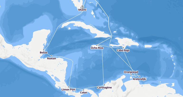 Itinerary: Miami, Fun day at sea, Ocho Rios, Fun day at sea, Carthagène, Colon, Limon Port, Fun day at sea, Roatan, Belize, Fun day at sea, Miami, Fun day at sea, Fun day at sea, Kralendijk, Oranjestad, Willemstad, Fun day at sea, Cabo Rojo, Ocho Rios, Fun day at sea, Miami
