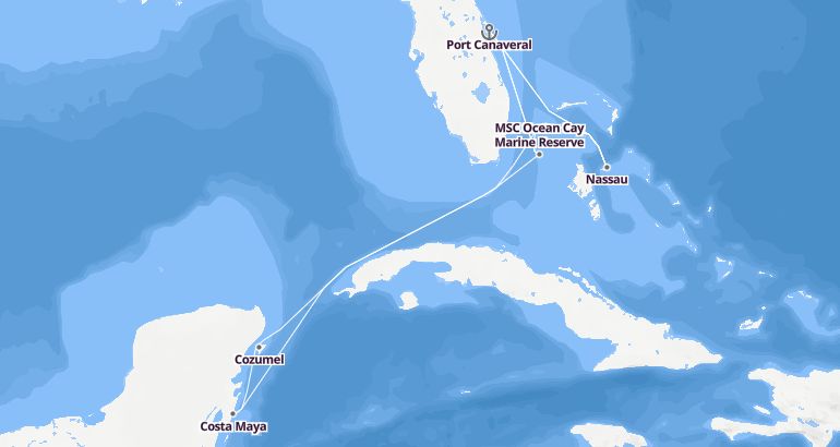 Itinerary: Port Canaveral, Nassau, MSC Ocean Cay Marine Reserve, Port Canaveral, Nassau, Fun day at sea, Cozumel, Costa Maya, Fun day at sea, MSC Ocean Cay Marine Reserve, Port Canaveral