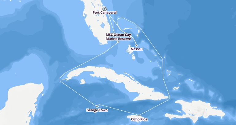 Itinerary: Port Canaveral, Nassau, MSC Ocean Cay Marine Reserve, Port Canaveral, Nassau, Fun day at sea, Ocho Rios, George Town, Fun day at sea, MSC Ocean Cay Marine Reserve, Port Canaveral