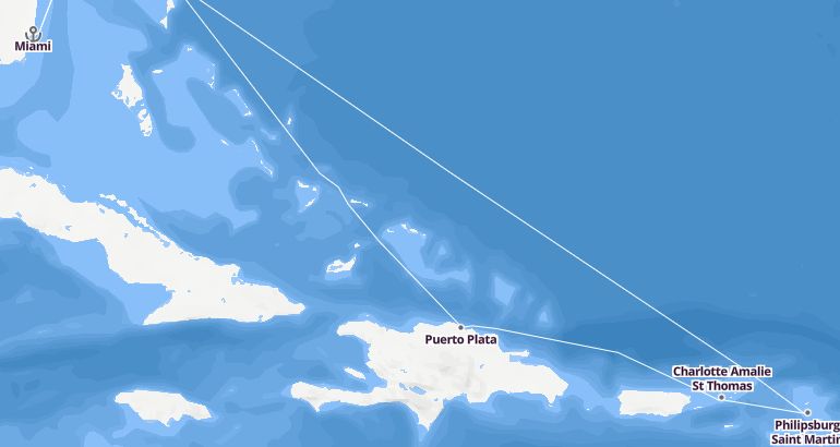 Itinerary: Miami, Fun day at sea, Fun day at sea, Philipsburg Saint Martin, Charlotte Amalie St Thomas, Puerto Plata, Fun day at sea, Miami